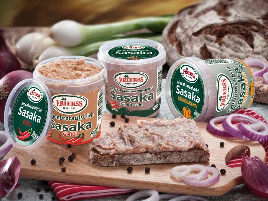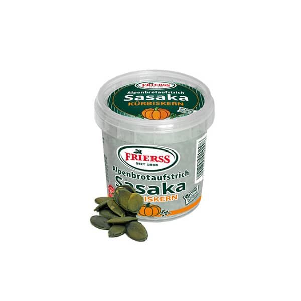 Sasaka – Alpenbrotaufstrich Kürbiskern, verfeinert mit edlen Gewürzen, Kürbiskernen und Kürbiskernöl. Frierss Kärntner Sasaka mit Kürbiskernen ist ein rustikaler Alpen-Brotaufstrich, eine regionale Spezialität die aus geräuchertem Speck mit feinen Gewürzen hergestellt wird. Hervorragend im Geschmack, bestens geeignet zu jeder deftigen Jause. Echt ausgezeichnet
